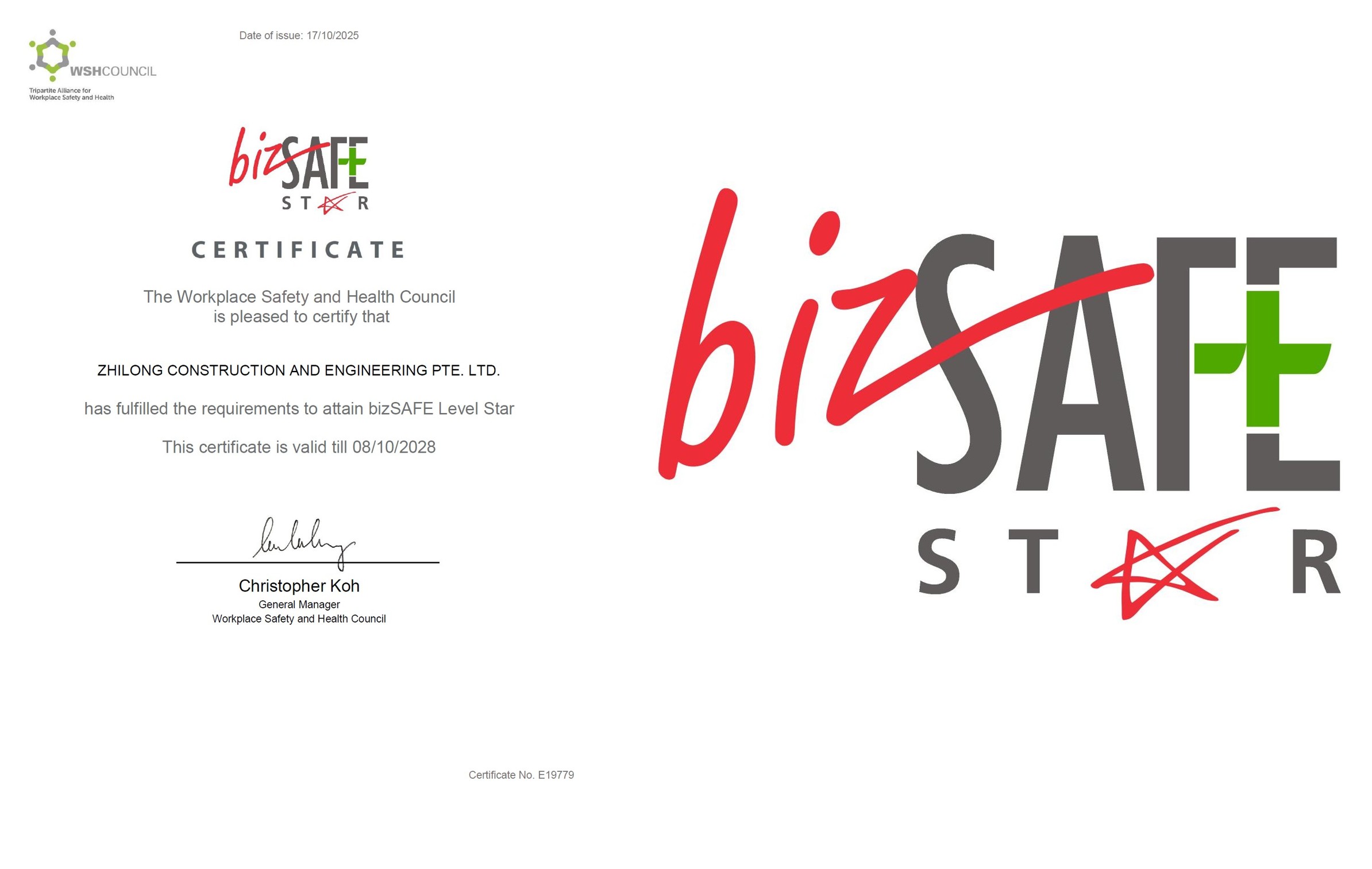 Our company demonstrated sustained excellence in WSH, proven through the comprehensive WSHMS that aligns with ISO 45001 standards and is compliant with the WSH Act. We are honored to obtain Biz Safe Star in this aspect.